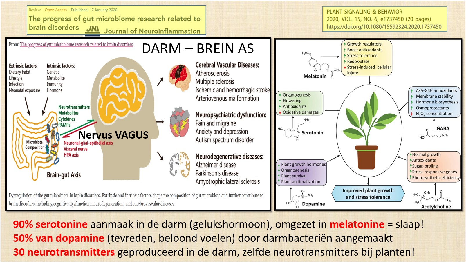 90% van de serotonine (gelukshormoon) in ons lichaam, dat verder omgezet wordt in melatonine (slaaphormoon, regeling van het dag/nacht ritme) wordt aangemaakt door onze darmbacteriën. 50% van de dopamine in ons lichaam(tevreden, beloond voelen) wordt door de darmbacteriën aangemaakt. Onze darmbacteriën maken een 30tal van die neurotransmitters aan. Neurotransmitters of overdrachtsstoffen zijn signaalstoffen, die zenuwimpulsen overdragen tussen zenuwcellen. Er worden een 30tal neurotransmitters geproduceerd in de darm, we zien dezelfde neurotransmitters ook bij planten, bij planten hebben ze wel een andere functie. Dit toont nog maar eens aan hoe alle leven op aarde met elkaar verbonden is.