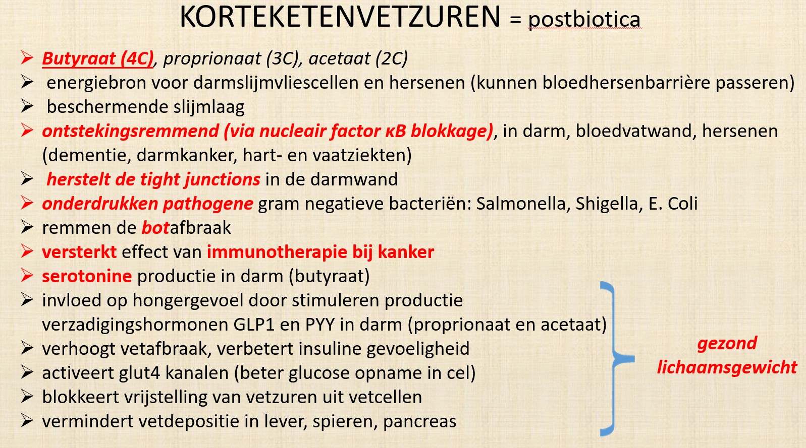 Onze stoelgang bestaat voor 60% uit bacteriën. Je scheidt dagelijks dus heel wat microörganismen uit, die maken plaats voor nieuwe en dat hangt in belangrijke mate af van wat je eet (hoeveel vezels en welke soorten vezels). Hoe meer soorten vezels je eet, hoe meer soorten gunstige bacteriën in je dikke darm huizen, hoe beter je immuunsysteem en afweermechanismen om welvaartsziekten te voorkomen en aan te pakken. Bacteriën en ook schimmels die in onze darm leven fermenteren vezels met de vorming van ontstekingsremmende korteketenvetzuren (butyraat of boterzuur, acetaat en proprionaat). Wat betreft de chemische structuur zijn boterzuur en acetaat zeer gelijkend aan de ketonen die in onze lever aangemaakt worden bij vetverbranding. Deze vetzuurketens van 2 tot 4 koolstofatomen zijn kleine moleculen die onze darmslijmvliesbarrière en ook bloedhersenbarrière kunnen passeren. Onze hersenen kunnen ze ook gebruiken als energiebron en ze zijn cruciaal om ons lichaam gezond te houden. Er zijn honderden soorten vezels in de natuur en elke plant en vrucht heeft zijn eigen vezelsamenstelling. Variëren is dan ook de boodschap.