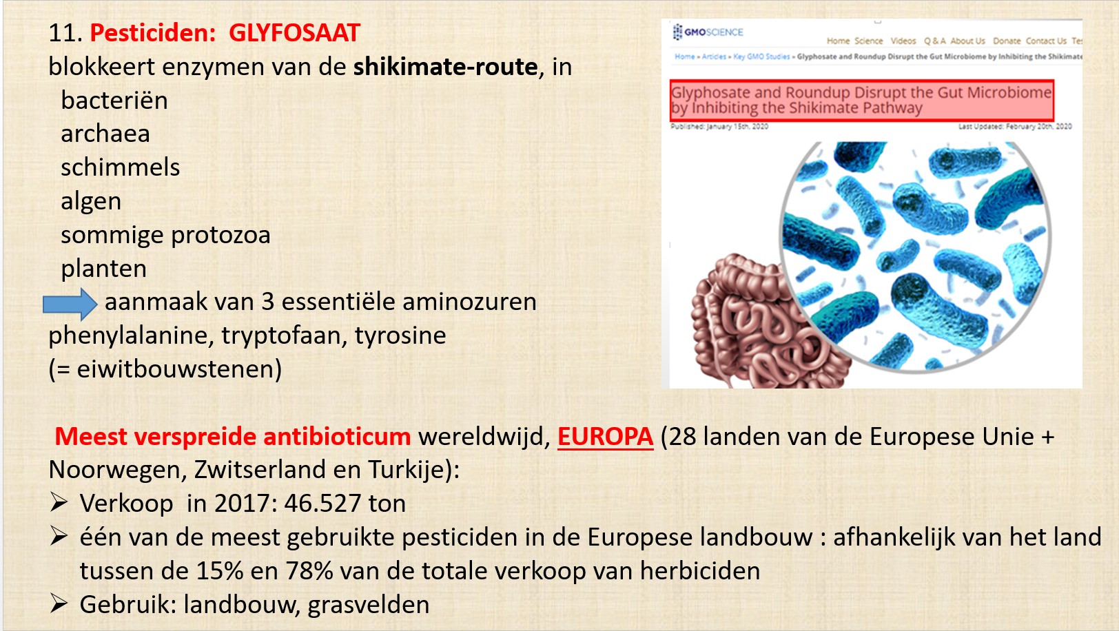 Het herbicide glyfosaat, het hoofdbestanddeel van Roundup, is het meest verspreide "antibioticum" wereldwijd. Het verhindert de aanmaak van 3 essentiële aminozuren (eiwitbouwstenen) in planten, bacteriën, archaea, schimmels, algen (Shikamate route). Deze organismen zijn afhankelijk van de Shikamate route om hun eiwitten aan te maken. Glyfosaat doodt alzo het microbiële bodemleven in de aarde dat zo essentieel is voor de aanbreng van mineralen en nutriënten via de wortels in planten. Dit speelt een cruciale rol in het immuunsysteem van de plant. Glyfosaat zorgt er alzo voor dat planten minder weerstandig zijn aan ziekten waardoor er meer nood is aan het gebruik van gewasbeschermingsmiddelen. Glyfosaat doodt ook de microörganismen in onze darmen als we voedsel eten met residu van glyfosaat, het doodt ook de gunstige bacteriën die we nodig hebben.