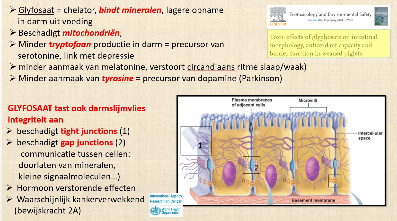 Daarnaast tast glyfosaat de darmslijmvliesintegriteit aan door het beschadigen van de tight junctions, de eiwitten die de darmslijmvliescellen mooi laten aansluiten (dit draagt bij aan het ontstaan van een lekkende darm). Glyfosaat heeft het hormoonverstorende effecten en wordt het door de WHO beschouwd als waarschijnlijk kankerverwekkend (bewijskracht 2A wat betekent aangetoond bij dierproefonderzoek en waarschijnlijk effect bij de mens).
