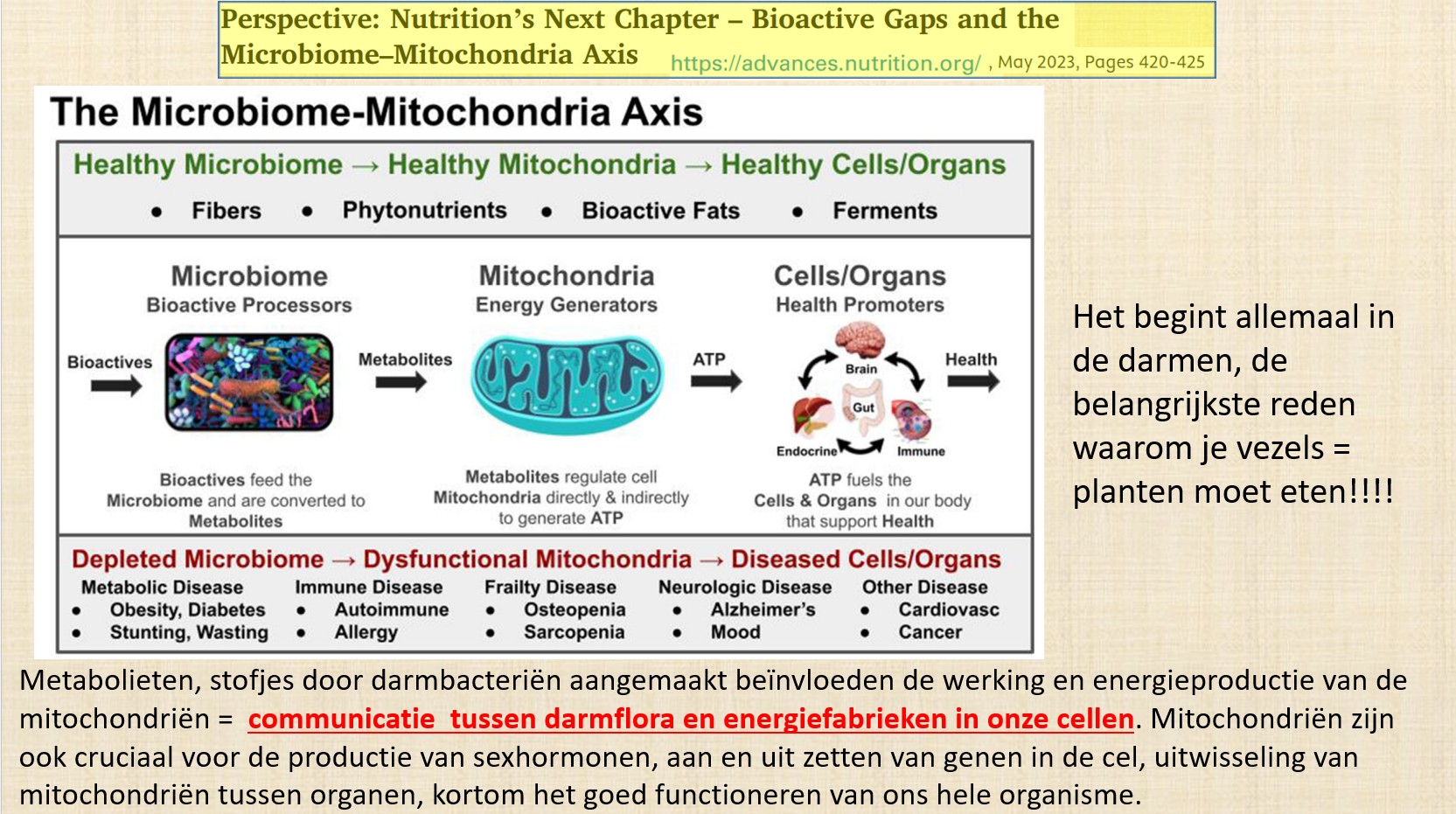 Een vezelarme voeding leidt dus tot veranderingen in de darmflora en kan een onherstelbaar verlies van bepaalde darmbacteriėn over de generaties heen tot gevolg hebben. Door een vezelarme voeding worden bepaalde darmbacteriesoorten zo schaars dat zij niet meer op een goede manier worden doorgegeven aan de volgende generatie waardoor ze dreigen uit te sterven. Een vezelrijke voeding is dus niet alleen belangrijk voor uzelf maar ook voor uw (toekomstige) kinderen." ( https://www.natuurdietisten.nl/voeding-en-darmmicrobioom-diversiteit/)