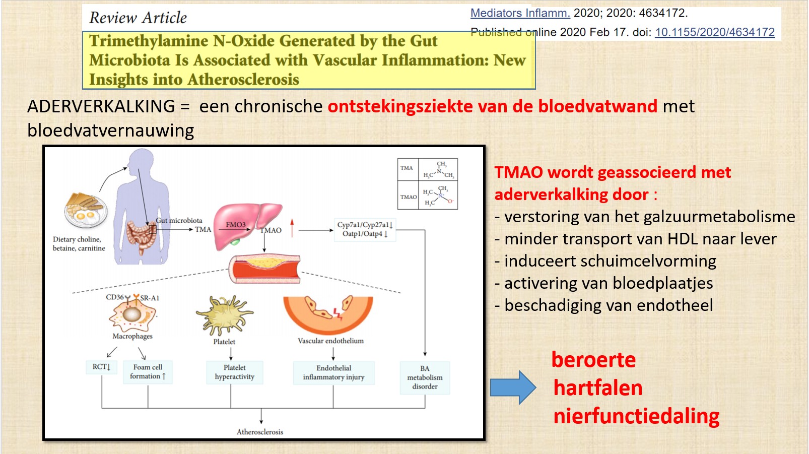 Carnitine in vlees en Choline in eieren worden in de darmen van vleeseters door de darmbacteriën omgezet in trimethylamine (TMA) . TMA komt via het bloed in de lever terecht waar het geoxideerd wordt tot Trimethylamine-N-oxide (TMAO). Studies hebben een duidelijk verband aangetoond tussen de spiegel van TMAO in het bloed en hart-en vaatziekten. Een plantaardig voedingspatroon zorgt voor een totaal ander microbioom in de darmen. Veganisten hebben niet de bacteriën in hun darmen die carnitine en choline omzetten in TMA. TMAO is rechtstreeks aanwezig in vis.