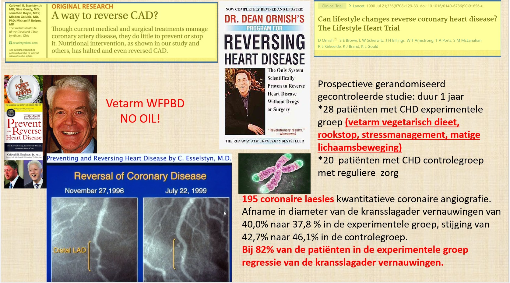 De Amerikaanse artsen Caldwell Esselstyn en Dean Ornish toonden aan dat een goed uitgebalanceerd plantaardig voedingspatroon arm aan verzadigde vetten en rijk aan vezels en antioxidanten onder vorm van groenten, fruit, noten, zaden , peulvruchten en volkoren graanproducten (Whole Food Plant Based Diet, WFPBD ), gecombineerd met voldoende lichaamsbeweging, stress management en niet roken, het lichaam terug kan helen en dit zelfs op vrij korte termijn. Reeds na 1 maand ziet men een verbetering van de bloedsomloop in de kransslagaders.