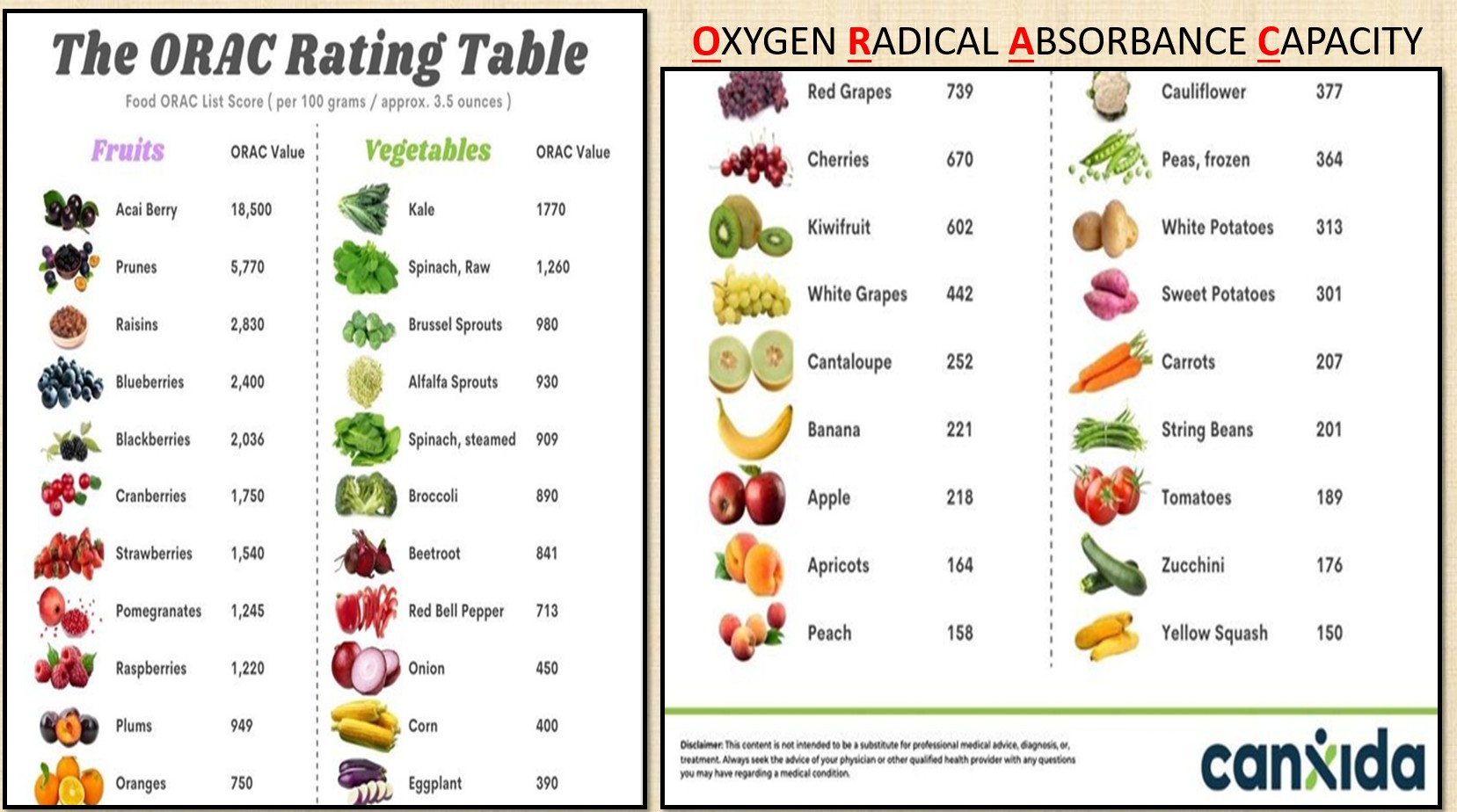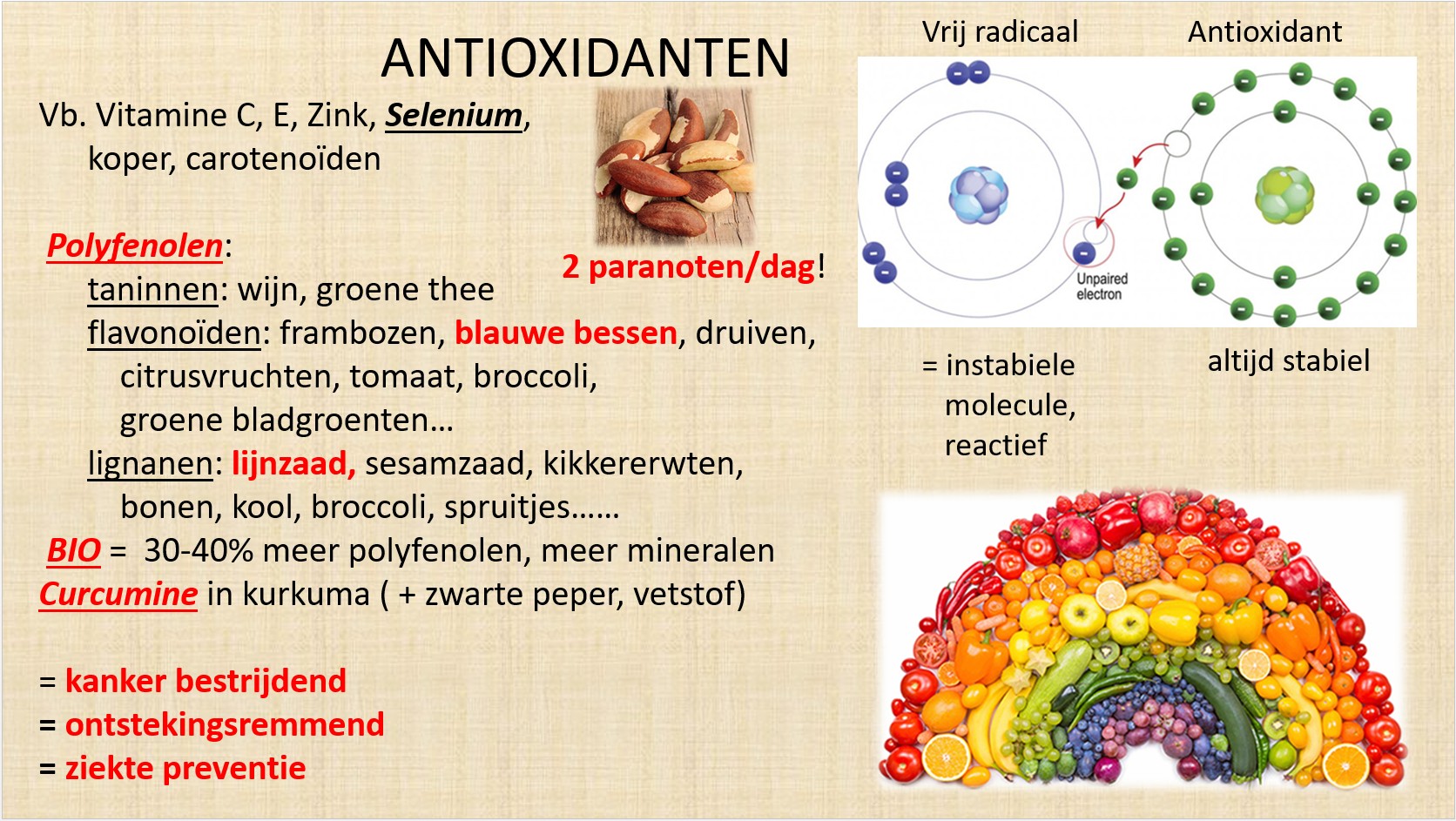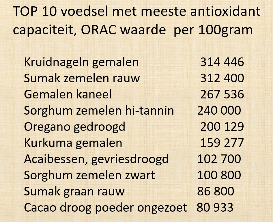 De antioxidant capaciteit van voedsel: groene groenten en bessen staan aan de top. Vergeet ook zeker niet de kruiden, het zijn niet alleen smaakmakers, ze dragen in belangrijke mate bij aan de preventie en heling van ziekten. In zijn natuurlijke vorm!!!! Niet in de vorm van supplementen. Er is geen deftig onafhankelijk wetenschappelijk onderzoek dat de werkzaamheid van supplementen aantoont. Moeder natuur verpakt alle micronutriënten in de juiste combinaties en vorm zodat ze hun werk kunnen doen in ons lichaam. Een stukje uit de natuur halen en in een capsule steken gaat weinig zoden aan de dijk brengen, in tegendeel, het kan zelfs schadelijk zijn doordat er vaak veel te hoge dosissen gebruikt worden.