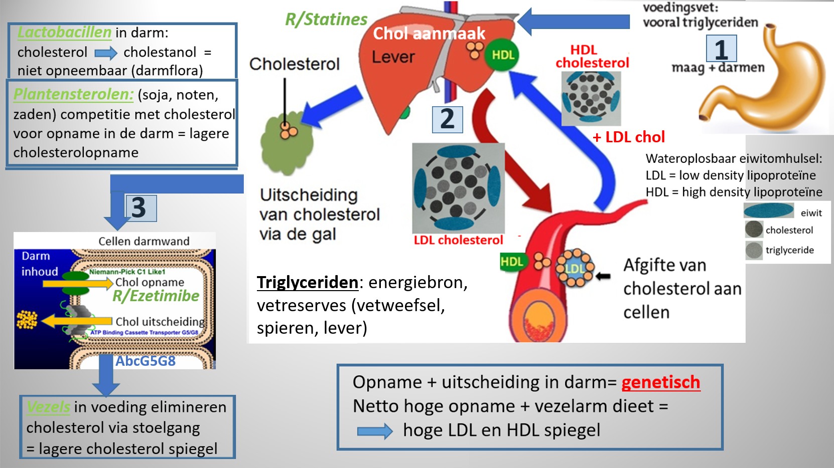 De oppervlaktecellen van ons darmslijmvlies bevatten een eiwit (Niemann-Pick C1 Like 1) dat zorgt voor de opname van cholesterol vanuit de darm naar de bloedbaan en een eiwit (ATP Binding Cassette Transporter) dat het omgekeerde doet, uitscheiding van cholesterol in de darm. Beide eiwitten hebben een gen dat codeert voor de aanmaak ervan, het zijn die genen die bepalen wat je lichaam met cholesterol doet in je darm. De expressie of werking van genen is individueel verschillend. We weten dat leefstijlfactoren daarin een belangrijke rol kunnen spelen. Neem je veel cholesterol op en scheid je in verhouding weinig uit zal je cholesterolspiegel in je bloed hoger zijn. Absorbeer jij weinig cholesterol in je darm dan heb je lage cholesterolspiegels in je bloed.