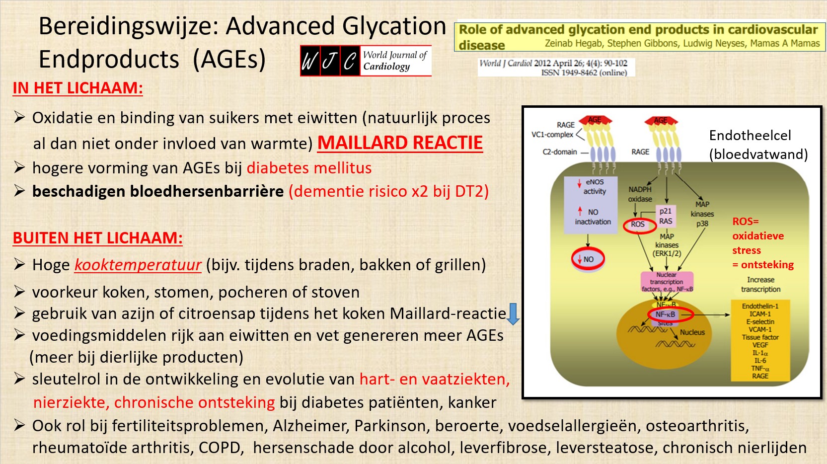 Advanced glycation endproducts (AGEs) ontstaan door oxidatie en binding van suikers met eiwitten en vetten bij verhitten van voedsel op hoge temperatuur (bakken, braden, frituren, grillen met bruine verkleuring, de zogenaamde Maillard reactie). AGEs veroorzaken oxidatieve stress in de endotheelcellen en verminderen de productie van NO door de endotheelcellen, ze spelen een sleutelrol in de ontwikkeling en evolutie van hart- en vaatziekten, nierziekten, chronische ontsteking bij diabetes patiënten en zijn gerelateerd aan heel veel welvaartsziekten.