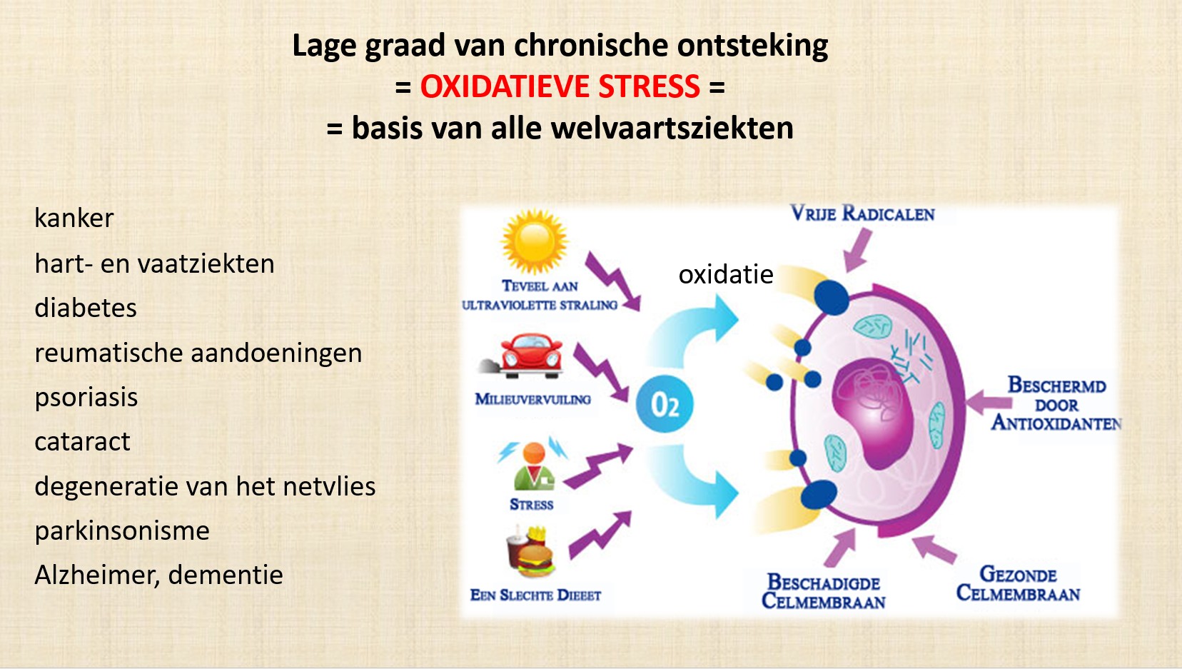 Ontsteking (inflammatie, oxidatieve stress) is de basis van alle welvaartsziekten. Een ontstekingsremmend eetpatroon dat de vrije radicalen die ontstaan bij schadelijke oxidatieve processen in ons lichaam (gerelateerd aan een ongezonde levensstijl) neutraliseert die vrije radicalen en gaat ziekte voorkomen en ook omkeren.