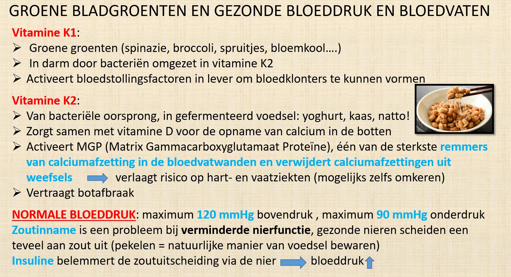 Nitraat in groene bladgroenten wordt in het achterste derde van je tong diep tussen je smaakpapillen in een zuurstofarm milieu door daar aanwezige bacteriën omgezet in nitriet wat verder via je slokdarm in je maag terecht komt. In het zure maag milieu wordt nitriet omgezet in stikstofoxide (NO) dat in je bloedbaan wordt opgenomen en bijdraagt aan de gezondheid van je bloedvaten en een lagere bloeddruk door het bloedvat verwijdend effect. Maagzuurremmers, medicijnen die veel te snel en te lang worden voorgeschreven, blokkeren de maagzuurproductie en hebben alzo een bloeddruk verhogend effect en dragen aldus bij tot het ontstaan van hart- en vaatziekten. Wanneer het bloed onder hoge druk door je bloedvaten stroomt beschadigt dit de tere vaatwand. De aanbeveling is dan ook een bovendruk van maximum 120 mmHg en onderdruk van maximum 90 mmHg