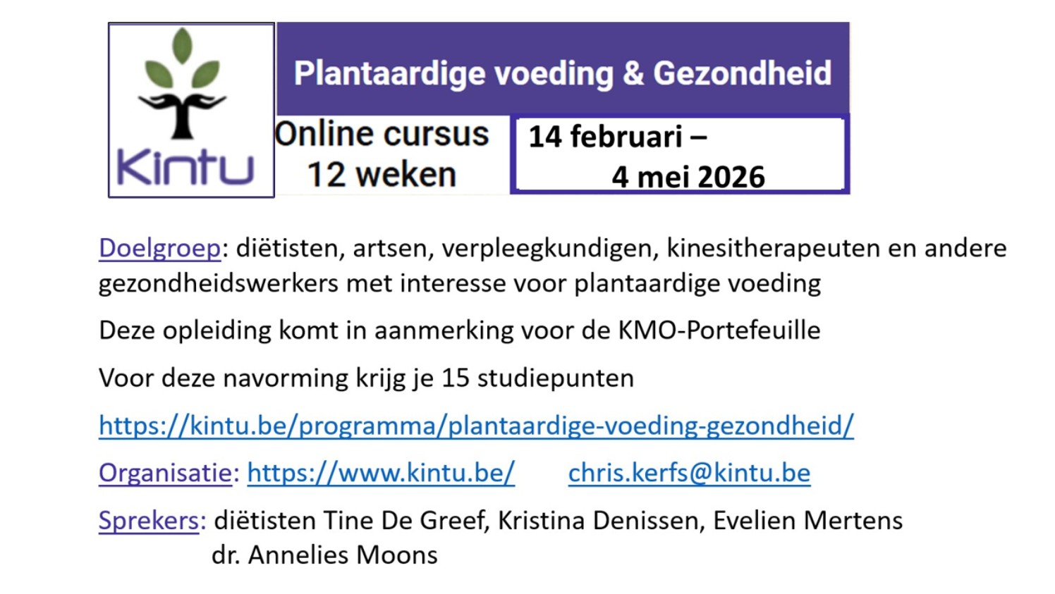 Doelgroep: Diëtisten, artsen, verpleegkundigen, kinesitherapeuten en andere gezondheidswerkers met interesse voor plantaardige voeding